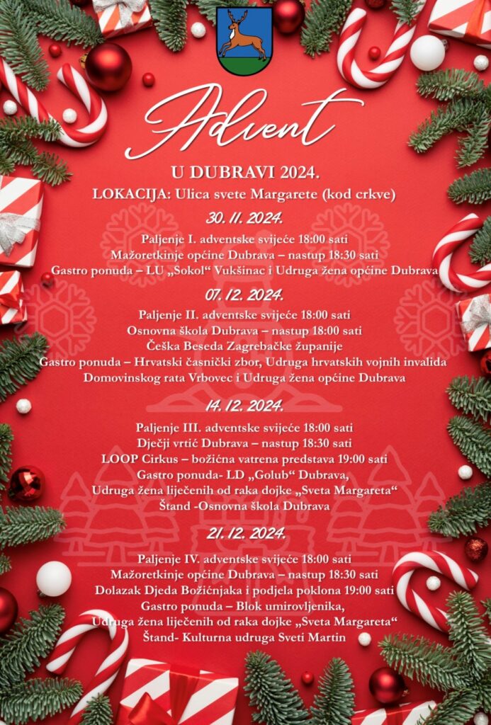 Svi su pozvani da se pridruže i uživaju u blagdanskoj atmosferi koja će trajati tijekom cijelog Adventa u Općini Dubrava.
